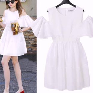 2015夏女裝歐美時尚顯瘦短袖圓領喇叭袖露肩連衣裙 /