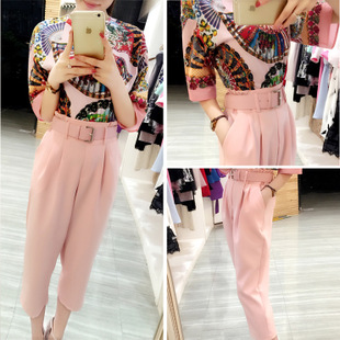 歐洲站2015夏季新款大碼女裝數(shù)碼印花真絲短袖T恤+哈倫褲套裝 /