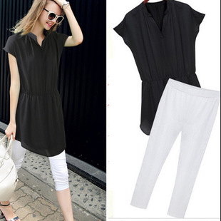 歐洲站2015大碼女裝夏季V領(lǐng)短袖收腰雪紡上衣+胖MM休閑套裝 /