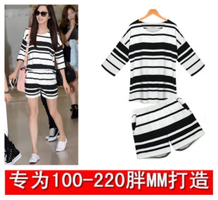 2015歐美大牌胖MM不規(guī)則條紋寬松顯瘦圓領(lǐng)中袖+大碼短褲套裝 /