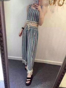現貨2015夏季新款時尚民族風闊腿褲流蘇背心雪紡兩件套裝潮 /