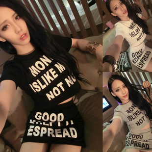 2015夏季新款韓版女裝性感潮女短款露肚臍字母T恤短裙套裝女 潮 /