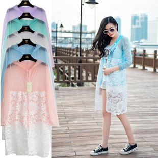 2015韓版時(shí)尚學(xué)院風(fēng)蕾絲繡花拼接中長(zhǎng)款連帽防曬衣夏季新款外套潮 /