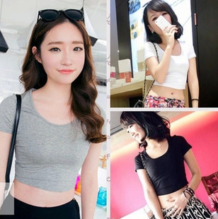 米朵露臍T恤 高腰短款露臍上衣 夏季百搭復古緊身性感超短AA短袖 /