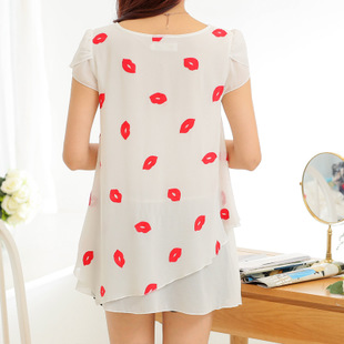 實拍2015春裝新款韓版修身雪紡衫女刺繡紅唇印花襯衫夏大碼# /