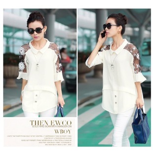 2015春夏最新款娃娃領拼接蕾絲袖 韓版打底衫 雪紡衫 襯衣女 /
