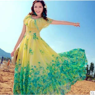 2015春夏新品沙灘裙 韓版修身印花雪紡連衣裙 波西米亞長裙 /