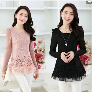 2015春裝新款上衣t恤女長袖打底衫韓版中長款甜美修身蕾絲衫 /