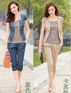 2015夏裝新款韓版時尚修身拼接 哈倫短袖七分褲三件套女 /