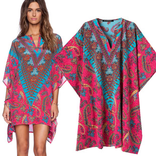 歐州站15季新品時尚女裝 復古圖騰印花寬花雪紡連衣裙短裙 D-BH /