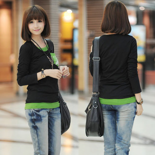 服裝加盟一件代發免費代銷 代理網上開店指供假兩件套貼布長袖T恤 /