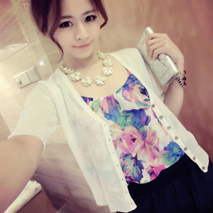 簡介: 貨號 9906 產地 東莞大朗 主圖來源 實拍有模特 貨源類別 現貨 風格 甜美 圖案 印花 毛種類 棉類 毛衫工藝 針織 厚薄 薄 款式 開衫 組合形式 單件套 版型 寬松型 衣長 短款(40cm<衣長≤50cm) 衣門襟 單排扣 領型 圓領 袖長 五分袖/中袖 袖型 常規袖 流行元素 拼接,鏤空 工藝 拼貼/拼接 上市年份/季節 2015夏季 顏色 白色,黃色,黑色,皮紅色,玫紅色,桔紅色 尺碼 均碼