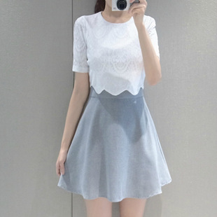 2015新款韓版女裝拼接雪紡假兩件短袖連衣裙 夏季短裙一件代發 /