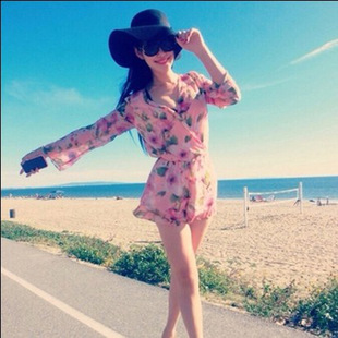 2015夏裝新款沙灘雪紡長袖連體褲V領套頭時尚印花連體休閑短褲潮 /