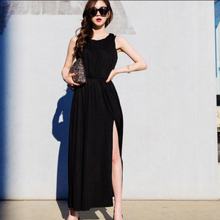 女士連衣裙2015夏季新款單側開叉女裝韓版時尚修身無袖褶皺中長裙 /