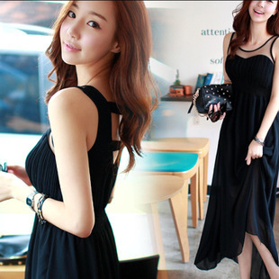 網紗連衣裙2015夏季新款雪紡純色露背輕熟女吊帶透明拼接抹胸長裙 /