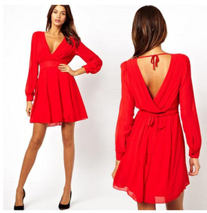 歐美女裝氣質長袖V領收腰雪紡連衣裙 性感夜店裙 爆款直銷 /