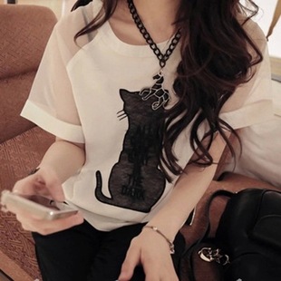 短袖女T恤雪紡拼接打底衫寬松貓咪可愛圖案圓領上衣動物蕾絲 /
