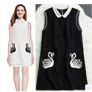 2015夏季新款女裝天鵝刺繡撞色娃娃領無袖連衣裙背心裙 /