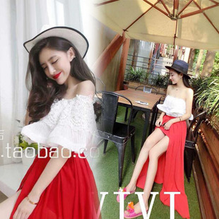 仙 名媛鉤花刺繡蕾絲紗荷葉邊露肩一字領上衣+開叉半身裙長裙 /
