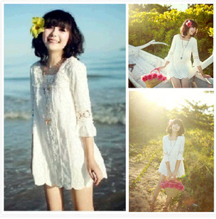 新款 韓版 淑女海邊沙灘裙 全蕾絲勾花 連衣裙 /