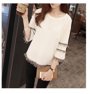 #春裝新品韓版時尚流蘇花邊中袖寬松百搭上衣大碼針織衫潮 /