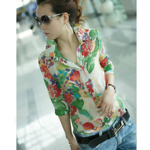2015夏新款女裝復古碎印花原版高檔雪紡衫五分袖修身雪紡襯衣 /