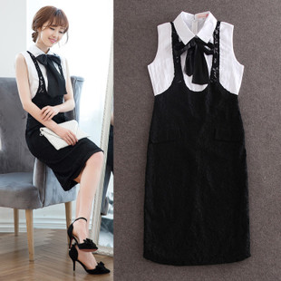 2015夏裝新款無袖翻領拼接蕾絲修身連衣裙 /