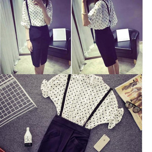 夏季兩件套裙子名媛小香風修身短袖黑白點點背帶套裝女 /