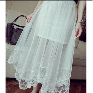 春夏新款韓版下擺蕾絲半身裙高腰透視長裙不規則大擺網紗裙 /