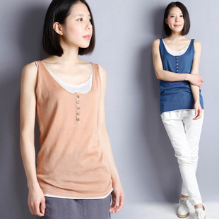 棉麻背心女式復古風格小背心假兩件針織雪紡吊帶衫內搭寬松女背心 /