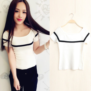 夏季韓版修身條紋針織女短袖露肩一字領針織T恤女薄上衣廠家直銷 /