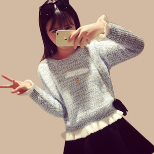 廠家供應套頭混色針織打底衫韓版荷葉邊下擺圓領套頭毛衣女 /