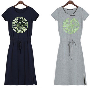 2015新款歐美風顯瘦衛衣長裙字母印花系帶短袖連衣裙 /