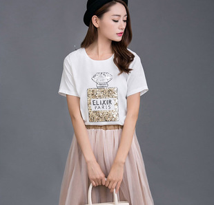 夏裝新款女韓版時尚亮片香水瓶圖案短袖雪紡衫打底衫T恤 /