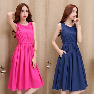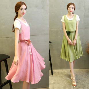 2015夏裝文藝范韓版純色小清新棉麻背心顯瘦短袖連衣裙女裝新款 /