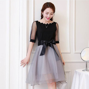 夏季連衣裙2015新款韓版時尚套裝裙女裝兩件套歐根紗復古短袖 /