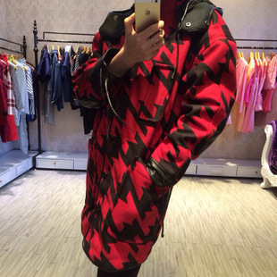 2014秋冬新款時尚女裝羊毛大衣紅黑千鳥格包邊寬松款連帽大衣 /