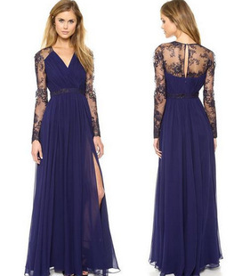 雪紡連衣裙夏季長裙2015修身顯瘦歐美女裝蕾絲拼接長袖鏤空大擺裙 /