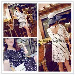 2015夏季新款韓版時尚氣質后背鏤空領清爽小方格幾何雪紡連衣裙潮 /