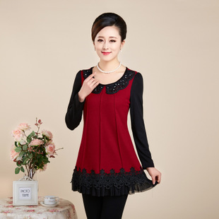 春季新款中老年女裝連衣裙 媽媽裝長袖大碼蕾絲花邊打底衫連衣裙 /