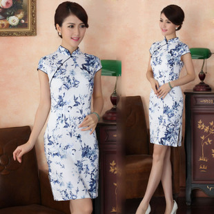 2015夏季青花瓷復古小女人旗袍唯美印花收腰開叉短款旗袍 714 /