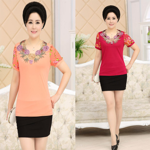 2015新品夏季媽媽裝中老年女裝40歲媽媽針織衫繡花紗袖T恤雪紡衫 /