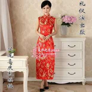 滴水領鳳尾花長款旗袍 大紅迎賓剪彩禮儀表演唐裝旗袍 拍照長旗袍 /