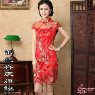 新款刺繡蕾絲喜慶旗袍 改良復古修身性感短旗袍 結婚旗袍敬酒禮服 /