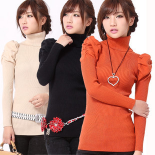 2014新款韓版女裝復古泡泡袖 修身顯瘦堆領(lǐng)高領(lǐng)針織衫打底衫毛衣 /