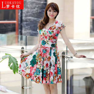 2015夏新款韓版牛奶絲短袖V領印花中長款連衣裙大碼女裝沙灘裙子 /