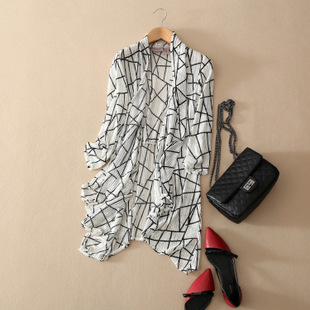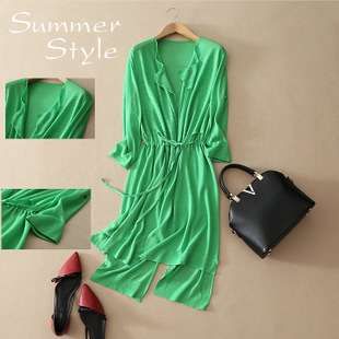 夏季新品原單歐美風長款針織衫 外貿寬松七分袖挽袖系繩開衫上衣 /