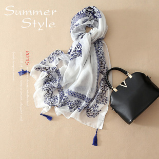 2015歐美原單新款夏季防曬遮陽披肩 外貿名族復古青花瓷純棉圍巾 /