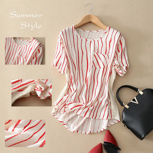 2015夏季日本原單舒適純棉條紋T恤女 外貿花邊拼接田園風短袖上衣 /